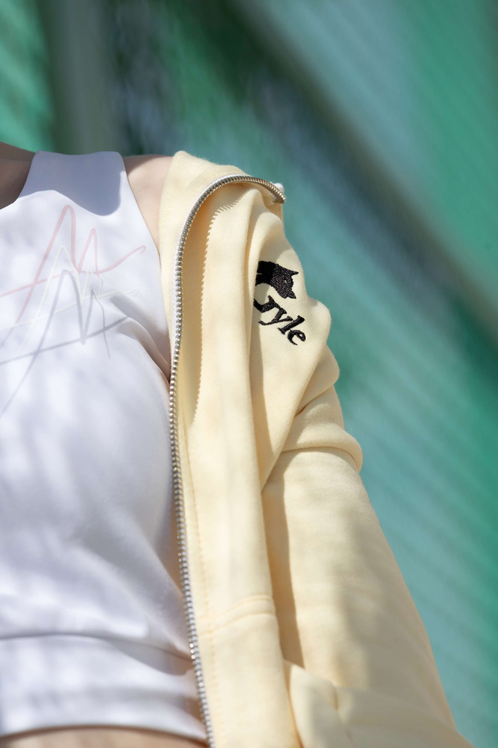 Beige jacket designed to fit easily in your sports bag for light breezes. Its adaptable style makes it perfect to wear over anything.