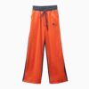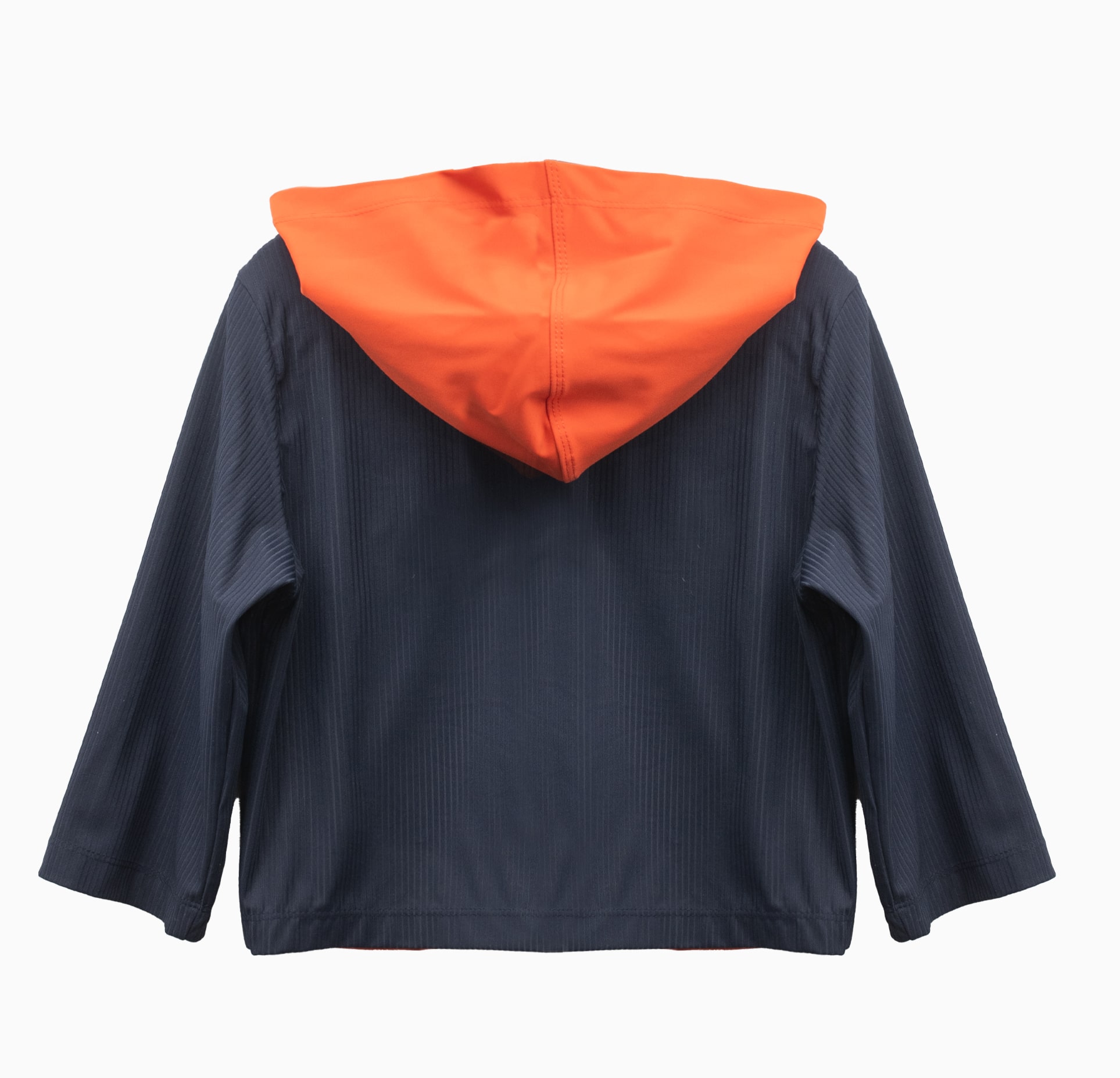 This zip-up hoodie features bold orange and dark color-blocked sleeves. Ideal for layering over casual or athletic outfits, this jacket combines style and comfort effortlessly.