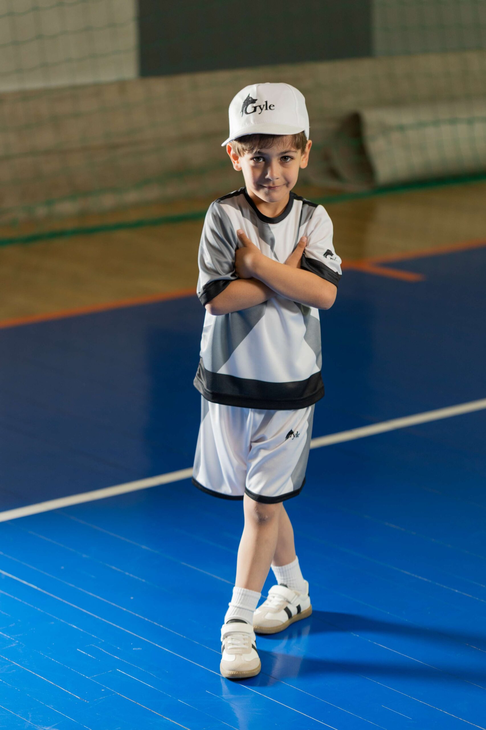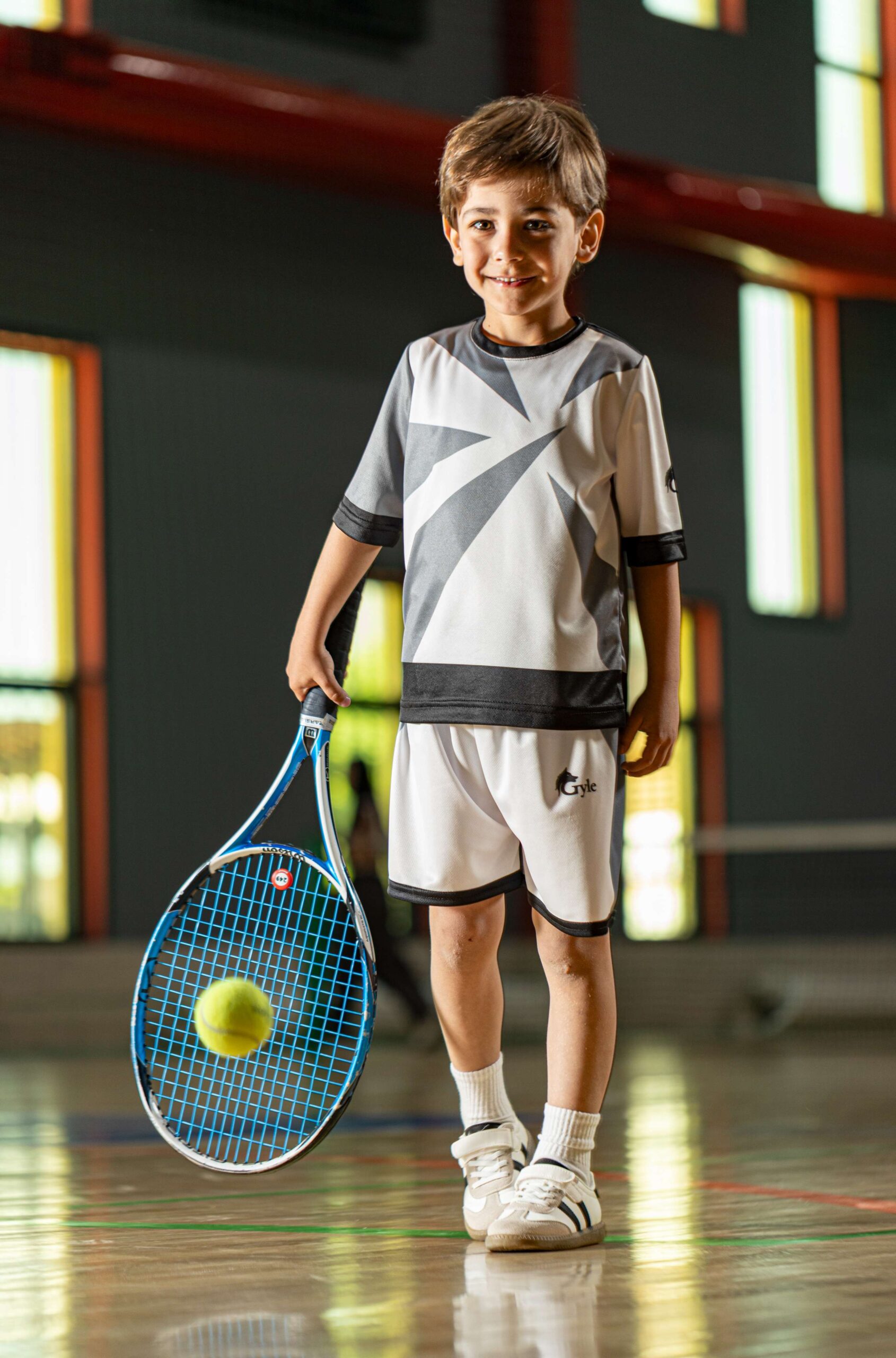 This white and grey lightweight top is breathable and comfortable, perfect for tennis, football, or your boy’s favorite sport. It comes with matching white shorts made from the same breathable fabric.
