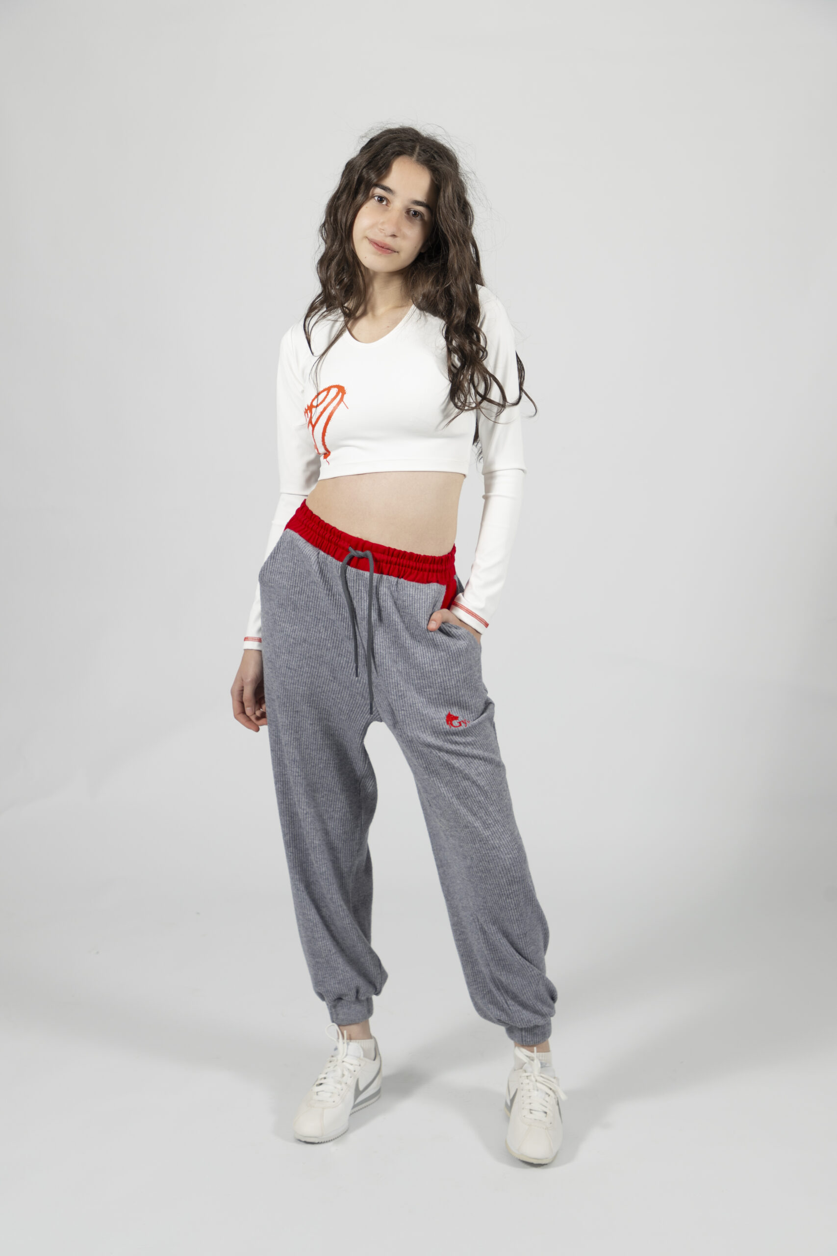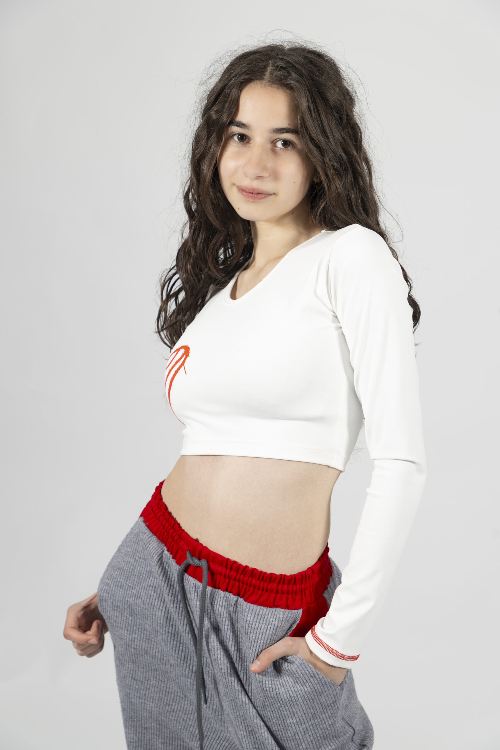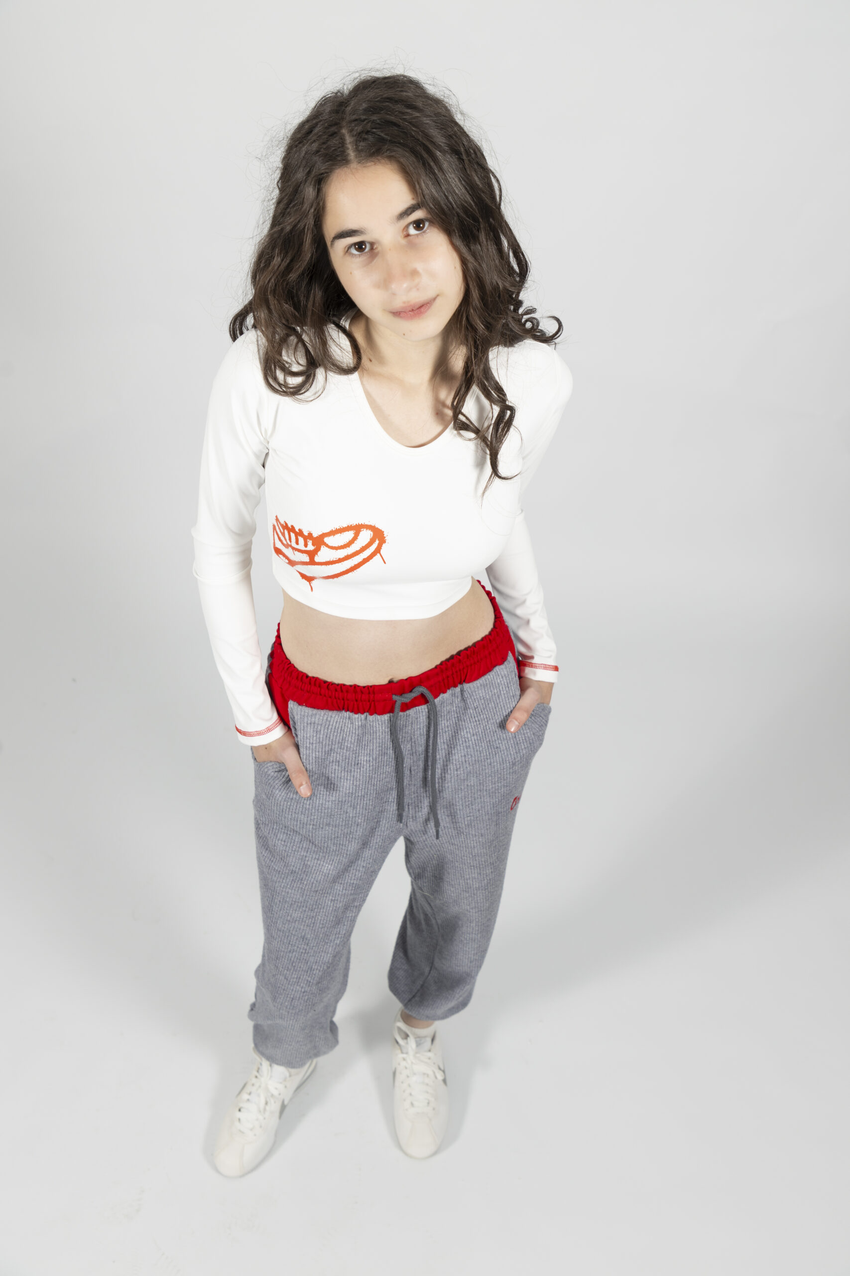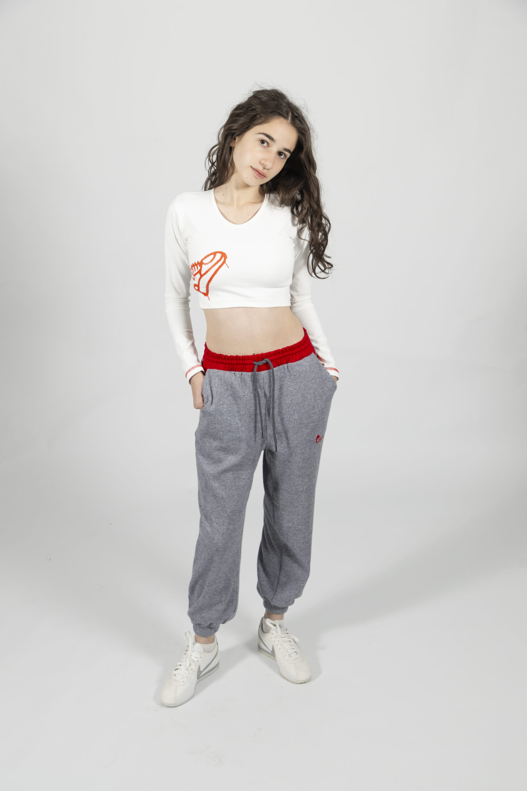 Белый укороченный топ с красными деталями в спортивном streetwear-стиле.